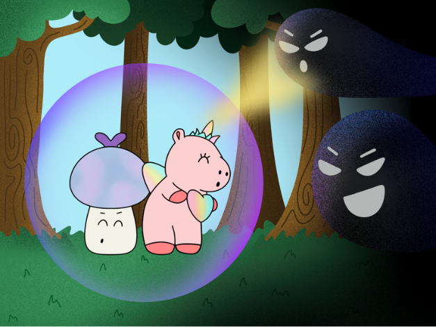 Con valentía y determinación, Gonita usó la luz mágica de su cuerno espiral para contrarrestar la oscuridad de Sombrío. Honguito, por su parte, desprendía destellos de colores brillantes, creando un escudo mágico que protegía a Gonita. Juntos, lograron debilitar las fuerzas oscuras y devolver la paz al bosque de Eclipsia.