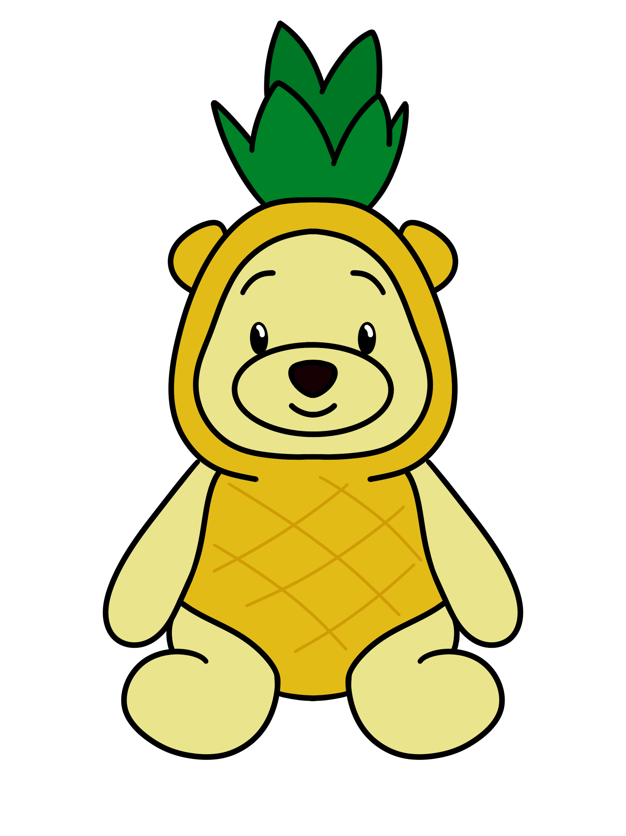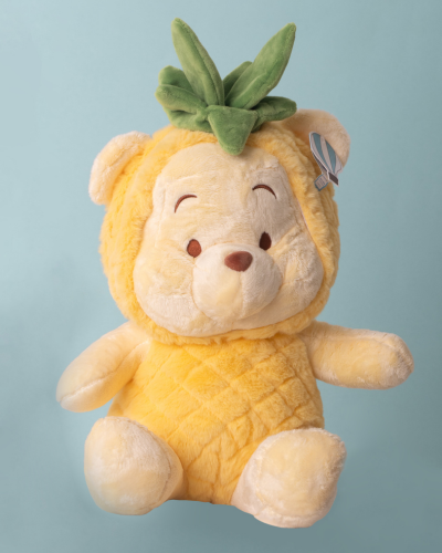 "¡Hola, soy el osito que hace de la vida una fiesta tropical! Con mi disfraz de piña, estoy listo para arrancar sonrisas y derretir corazones. ¡Cuidado con mi abrazo, es tan dulce como una torta de piña recién horneada!